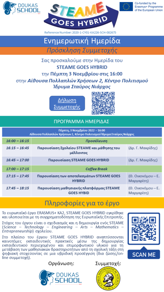 A STEAME GOES HYBRID event organised by Doukas School in Athens, Greece on the 3rd of November 2022. The event will be realised at “Aithousa Pollaplon Hriseon 2” of the Stavros Niarchos Foundation Cultural Center. Dr. Gregory Makrides, president of the Cyprus Mathematical Society and coordinator of the project will participate in the event.